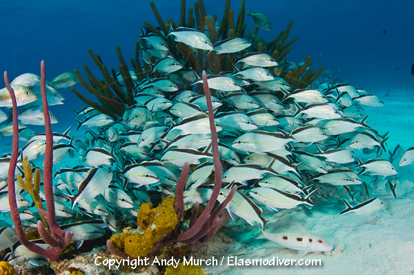 The Cottonwick (Haemulon melanurum) is easily distinguished from other grunts by the angled black bar that runs along each side of its back and tail. These cottonwick pictures are available for commercial licensing. For further information regarding usage please e-mail Elasmodiver.