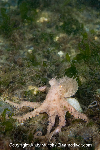 The Pacific red octopus (Octopus rubescens) is a common inhabitant of the Pacific Coast of North America. Divers often find this octopus hiding inside discarded bottles and other man-made dwellings lying on the sea floor. These Pacific red octopus pictures are available for commercial licensing. For further information regarding usage please e-mail Elasmodiver.